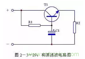 當(dāng)對(duì)濾波效果要求較高時(shí),可以通過增加濾波電容的容量來提高濾波效果。但是受電容體積限制,又不可能無限制增大濾波電容的容量,這時(shí)可以使用有源濾波電路。其電路形式見圖2-3-29,其中電阻R1是三極管T1的基極偏流電阻,電容C1是三極管T1的基極濾波電容,電阻R2是負(fù)載。這個(gè)電路實(shí)際上是通過三極管T1的放大作用,將C1的容量放大β倍,即相當(dāng)于接入一個(gè)(β+1)C1的電容進(jìn)行濾波。