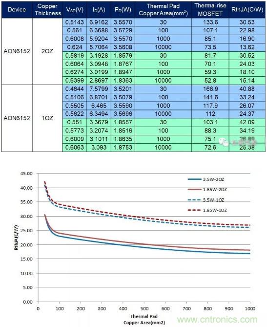 下面分別以一塊10cmX10cm、2OZ覆銅的二層PCB板來做試驗(yàn),板厚1.5mm,PCB底層覆銅沒有通過過孔連接到頂層,將封裝為DFN5*6器件AON6152焊接在PCB板,同時(shí)AON6152的D極下面分別鋪設(shè)四種不同尺寸的銅皮:30mm2、100mm2、1000mm2、10000mm2。然后給四塊板的AON6152灌入相同的功率,測量AON6152的溫升,計(jì)算相應(yīng)的熱阻RJA。將AON6152灌入功率減小一半,重復(fù)上面的實(shí)驗(yàn),測量其溫升,再次計(jì)算相應(yīng)的熱阻RJA。