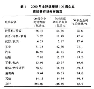 自2001年以來,受“9.11”恐怖事件、網(wǎng)絡(luò)通訊業(yè)泡沫破滅及美國經(jīng)濟(jì)低迷的影響,世界連接器市場一度遭受重創(chuàng),2001年的銷售額下降19.1%,但是,軍用連接器市場卻在平穩(wěn)中微增。據(jù)Fleck的研究報(bào)告,軍事/航天用連接器2000年的銷售額為20.072億美元,2001年達(dá)到20.118億美元,增長0.2%。全球連接器100強(qiáng)企業(yè)占據(jù)了69.1%軍用連接器市場份額,如表1所示。各類軍用連接器也基本上由全球100強(qiáng)企業(yè)所壟斷,如表2所示。