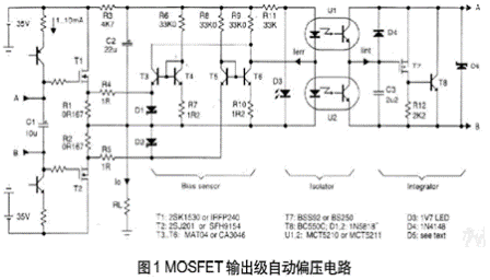 MOSFET的偏壓視實際使用的管子而定,通常在2V至10V間變化。為了應對這一范圍,最終確定圖1 所示的自動拓撲結(jié)構(gòu)。積分器采用積分并聯(lián)穩(wěn)壓器,不僅結(jié)構(gòu)簡單,而且有較高的精度,還顯示出足夠低(<2Ω)的動態(tài)輸出阻抗,能滿足來自驅(qū)動級AC電流的要求。為了排除高頻處的交互作用,積分電容C3的取值應使伺服環(huán)的單位增益頻率低于音頻譜。通常在1Hz與10Hz之間,具體數(shù)值取決于光耦合器的傳輸比,D4的作用是在管子截止期間讓C3放電,從而保護T7的柵極,想要可靠地工作;積分器輸入端低漏電是至關(guān)重要的,因此D4應避免光照。穩(wěn)壓二級管D5額定值為最大可能偏壓加上少量的余量,以適應特定設計的要求。倘若某個元件發(fā)生故障,或加以極端的測試信號,該二級管能保護輸出級免受過大共模電流的損害。