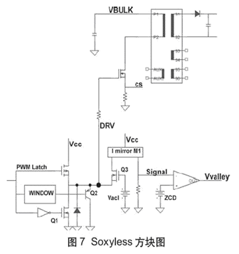 Soxyless模塊的主要功能為:?jiǎn)?dòng)PNP;禁用推挽驅(qū)動(dòng)器的下部NFET;在漏極電壓振蕩的負(fù)dV/dt部分在驅(qū)動(dòng)器輸出DRV上形成“虛擬地”;捕獲(流出DRV輸出端的)負(fù)電流;檢測(cè)“正向ZCD DRV電流”。