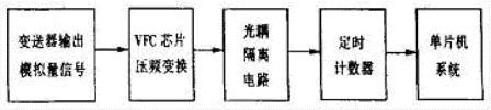另一種模擬量傳輸?shù)慕鉀Q方法,就是采用VFC(電壓頻率轉(zhuǎn)換)方式,如圖3所示?,F(xiàn)場變送器輸出模擬量信號(假設(shè)電壓信號),電壓頻率轉(zhuǎn)換器將變送器送來的電壓信號轉(zhuǎn)換成脈沖序列,通過光耦隔離后送出。在主機側(cè),通過一個頻率電壓轉(zhuǎn)換電路將脈沖序列還原成模擬信號。此時,相當(dāng)于光耦隔離的是數(shù)字量,可以消除光耦非線性的影響。這是一種有效、簡單易行的模擬量傳輸方式。