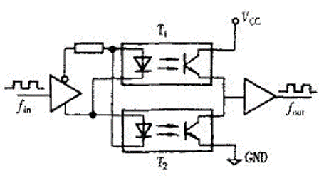 用2只光電耦合器T1,T2接成互補推挽式電路,可以提高光耦的開關(guān)速度,如圖5所示。當(dāng)脈沖上升為“1”電平時,T1截止,T2導(dǎo)通。相反,當(dāng)脈沖為“0”電平時,T1導(dǎo)通,T2截止。這種互補推挽式電路的頻率特性大大優(yōu)于單個光電耦合器的頻率特性。