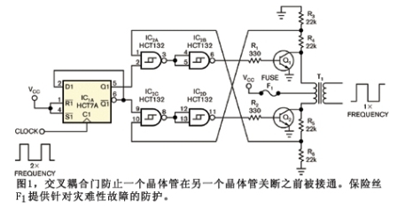 門IC2A防止Q1在Q2關斷之前被接通。同樣,門IC2C防止Q2在Q1關斷之前被接通。門IC2B和IC2D當作逆變器來提供正確極性,以便驅動開關晶體管。對晶體管集電極電壓的監(jiān)視功能利用分壓器R3/R4和R5/R6來傳感每個晶體管的關斷。由于集電極電壓擺動至電源電壓的兩倍,因此分壓器把電壓減半。過沖期間,分壓器的阻抗還把門的輸入電流限制在安全水平。開關頻率是輸入時鐘頻率的一半。D型雙穩(wěn)態(tài)多諧震蕩器IC1A把輸入時鐘頻率除以2,并提供50%占空比的補充輸出。補充輸出按交替順序驅動開關晶體管。變壓器T1的次級提供隔離的方波輸出。
