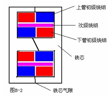 最后說一說繞組線圈的結(jié)構(gòu),因?yàn)槟憴C(jī)的后級都是用對管組成推挽電路的,為了防止由于兩管負(fù)載不平衡所引鐵芯起直流磁化,上下管的負(fù)載繞組不僅要做到電感一致,并且直流電阻也要一致,另外為了較少線間分布電容,在繞法上采取分層分邊的繞法,如圖B-2是音頻輸出變壓器繞組的結(jié)構(gòu)剖面圖。這種繞組結(jié)構(gòu)可使上下輸出管的總電抗保持一致,從減少線間的分布電容的角度來看,層分得越多越細(xì)越好,從而使輸出信號的頻響特性得到較好的改善。