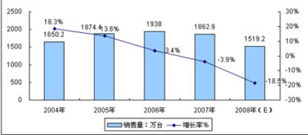 根據(jù)賽迪顧問(wèn)統(tǒng)計(jì)數(shù)據(jù)顯示,2008年1-10月中國(guó)DVD播放機(jī)市場(chǎng)共銷(xiāo)售DVD播放機(jī)1109.2萬(wàn)臺(tái),實(shí)現(xiàn)銷(xiāo)售收入55.3億元。下半年,DVD市場(chǎng)略有回暖,預(yù)計(jì)2008年銷(xiāo)售額將達(dá)1519.2萬(wàn)臺(tái),同比下降18.5%,而銷(xiāo)售收入達(dá)76.6億元,同比下降20.8%。2004-2008年中國(guó)DVD播放機(jī)市場(chǎng)銷(xiāo)售量復(fù)合增長(zhǎng)率為1.17%,銷(xiāo)售額復(fù)合增長(zhǎng)率為-5.1%。