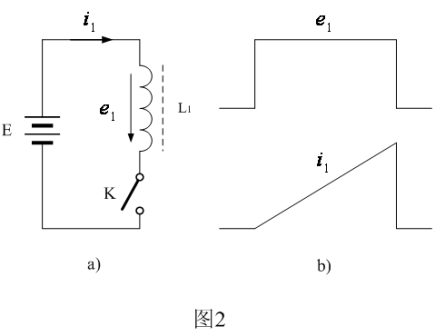 在圖1中,當(dāng)輸入電壓E加于開關(guān)電源變壓器初級(jí)線圈N1的兩端時(shí),由于變壓器次級(jí)線圈產(chǎn)生的電動(dòng)勢(shì)與流過二極管的電流方向正好相反,相當(dāng)于所有次級(jí)線圈均開路,此時(shí)開關(guān)變壓器相當(dāng)于一個(gè)電感L1。其等效電路如圖2-a) 所示,圖2-b) 是開關(guān)接通時(shí),電感兩端的電壓和流過電感L1的電流。