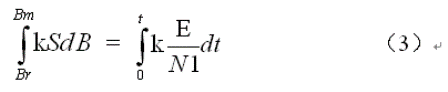 上式中,k是一個(gè)與單位制相關(guān)的系數(shù),S為變壓器鐵心的導(dǎo)磁面積,B為磁感應(yīng)強(qiáng)度,也稱磁通密度,即:?jiǎn)挝幻娣e的磁通量。把(2)式代入(1)式,并進(jìn)行積分: