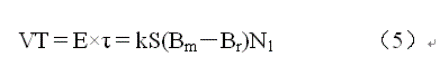 (5)式中, 就是變壓器的伏秒容量,即:伏秒容量等于輸入脈沖電壓幅度與脈沖寬度的乘積,這里我們把伏秒容量用VT來表示。伏秒容量VT表示:一個(gè)變壓器能夠承受多高的輸入電壓和多長時(shí)間的沖擊。
