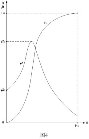 由圖4中可以看出,導(dǎo)磁率最大的地方并不是磁感應(yīng)強(qiáng)度或磁場(chǎng)強(qiáng)度最小或最大的地方,而是位于磁感應(yīng)強(qiáng)度或磁場(chǎng)強(qiáng)度的某個(gè)中間值的地方。當(dāng)導(dǎo)磁率達(dá)到最大值之后,導(dǎo)磁率將隨著磁感應(yīng)強(qiáng)度或磁場(chǎng)強(qiáng)度增大,而迅速下降;當(dāng)導(dǎo)磁率下降到將要接近0的時(shí)候,我們就認(rèn)為變壓器鐵芯已經(jīng)開始飽和。如圖中Bs和Hs。