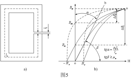 圖5-b) 中,虛線是沒留有氣隙變壓器鐵芯的磁化曲線,實(shí)線是留有氣隙變壓器鐵芯的磁化曲線;曲線b是留有氣隙變壓器鐵芯的等效磁化曲線,其等效導(dǎo)磁率,即曲線的斜率為 ;