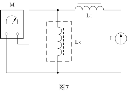 圖7是采用電流迭加法測(cè)試開(kāi)關(guān)變壓器電感量或伏秒容量的工作原理圖。圖7中,M是電感測(cè)試儀,LT是隔離電感,I是恒流源,Lx為待測(cè)開(kāi)關(guān)變壓器的初級(jí)電感。LT的電感量必須遠(yuǎn)遠(yuǎn)大于被測(cè)開(kāi)關(guān)變壓器初級(jí)線圈的電感量。下面我們來(lái)介紹圖7的工作原理。