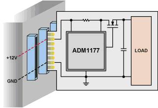 考慮一個(gè)具有12 V背板及一組可移除模塊的系統(tǒng)。每個(gè)模塊必須能在不影響任意相鄰模塊正常工作的條件下被移除和替換。當(dāng)沒(méi)有控制器時(shí),每個(gè)模塊可能會(huì)對(duì)電源線(xiàn)造成較大的負(fù)載電容,通常在毫法量級(jí)。首次插入一個(gè)模塊時(shí),其未充電的電容需要所有可用的電流來(lái)對(duì)其進(jìn)行充電。如果不對(duì)這個(gè)浪涌電流加以限制,這個(gè)很大的初始電流將會(huì)降低端電壓,導(dǎo)致主背板上的電壓大幅下降,使系統(tǒng)中的多個(gè)鄰近模塊復(fù)位,并破壞模塊的連接器。