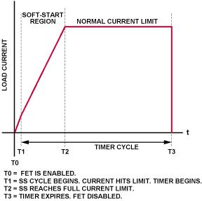 利用軟啟動(dòng),浪涌電流在軟啟電容設(shè)定的期間可以從零線(xiàn)性增加到滿(mǎn)量程。通過(guò)逐步提高基準(zhǔn)電流,能避免浪涌電流突然達(dá)到30 A的限制。需要注意的是,在軟啟過(guò)程中,電流處于調(diào)整過(guò)程中,因此,定時(shí)器從軟啟動(dòng)開(kāi)始之際就進(jìn)入工作狀態(tài),如圖5所示。