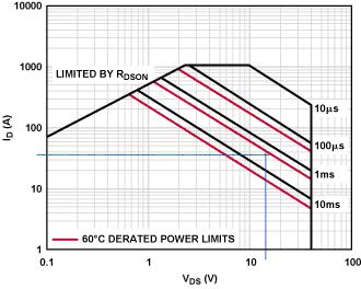 在40 V,降額后的功率所對(duì)應(yīng)的電流為14 A,在SOA圖上這點(diǎn)將確定新的62°C降額后的1 ms線(xiàn)。使用同樣的辦法可確定新的10 ms以及100 μs線(xiàn)。新線(xiàn)在圖6中以紅色示出。
