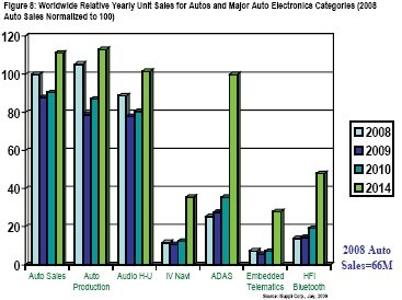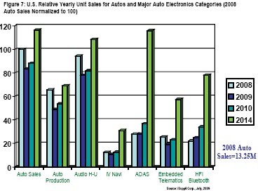美國汽車生產遠遠落后于銷售,因為在美國銷售的客車有很大一部分是在加拿大、墨西哥、歐洲和亞洲生產的。該圖還顯示汽車音響本體、車載導航、ADAS、嵌入遠程信息通訊和藍牙免提接口(HFI)電子的相對銷售情況。每個類別的銷售情況相近,都是在2009年下降,隨后幾年增長。只有藍牙HFI系統(tǒng)的銷售將在2009年上升,因為Ford Sync和類似系統(tǒng)取得了成功。
