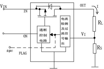圖2是一種帶過(guò)流保護(hù)的負(fù)載開(kāi)關(guān)結(jié)構(gòu)框圖,圖2中,RL是負(fù)載,RS是電流檢測(cè)電阻。流過(guò)RS的電壓降VRS與電流I成比例,此電壓VRS輸入負(fù)載開(kāi)關(guān)VI端。若內(nèi)部電流檢測(cè)電路檢測(cè)出有過(guò)流狀態(tài),輸出過(guò)流信號(hào)(電平信號(hào))給通、斷控制電路,關(guān)斷負(fù)載開(kāi)關(guān)。