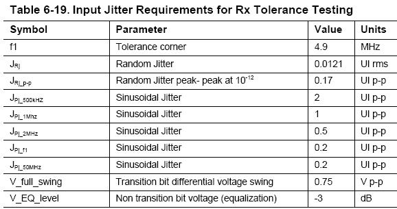 推薦的測試碼流是擾碼后的D0.0,對于USB3.0的誤碼率為 測試,一次需要大概10分鐘,而規(guī)范要求測量加入5個頻率正弦抖動時的誤碼,所以完成5個頻點的測試需要50分鐘,非常耗時。為了加快測試與驗證速度,在USB3.0 Electrical Compliance Methodology White Paper, Revision 0.5中提出一種快速測量接收機BER的方法,即加大各頻點的固有抖動數(shù)值后,只測量到誤碼率= ,這樣只需30秒即可完成5個頻點的抖動容限測試。如圖4所示為誤碼率= 的抖動容限測試參數(shù)。