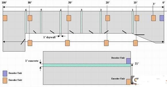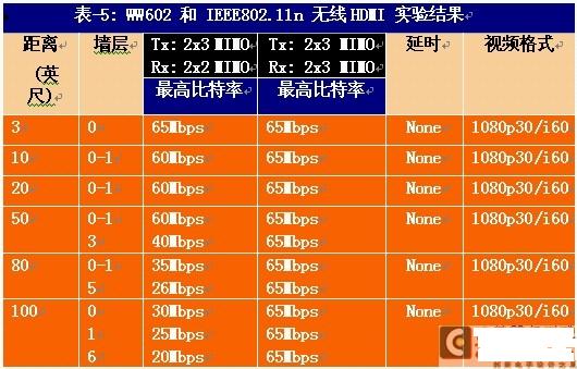 相對于可視距離的無線通信的應用,802.11n可實現(xiàn)更遠距離的(非可視距離)的多媒體通信,比如在家里的不同房間之間的音視頻通過無線播放。我們用標準的802.11的產(chǎn)品用來測試,證明魯棒性很好,可以穿越墻壁和混凝土樓板,圖-1是測試環(huán)境圖示,用SONY的PS3游戲機作為高清的視頻源,源和顯示設備之間距離100英尺并穿越6面墻,視頻的內(nèi)容包括游戲和電影視頻。表5是測試結(jié)果,一組是編碼端和解碼端都是2x3MIMO(2個發(fā)送天線和3個接收天線)的無線設備,另一組采用編碼端2x3MIMO,接收端2x2MIMO的無線設備。WW602編碼用20Mbps碼流的圖像質(zhì)量可超越高清電纜傳輸?shù)?-15Mbps的圖像質(zhì)量。