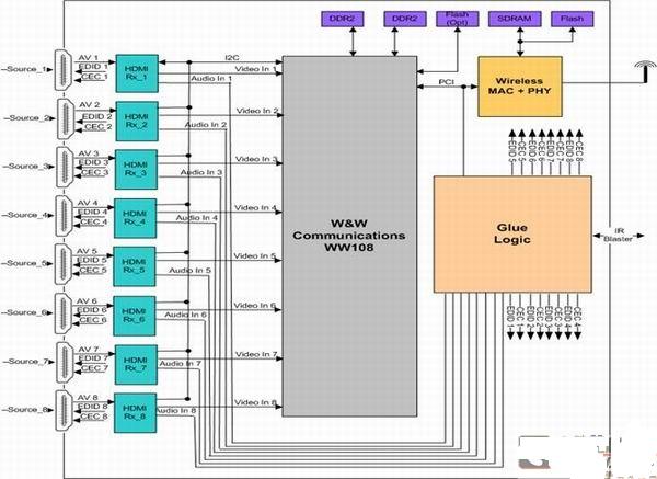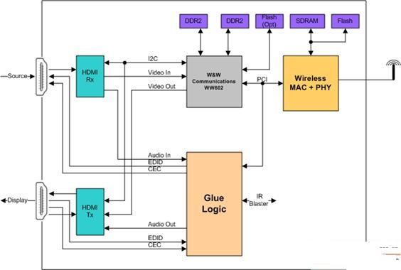 圖-2展示了基于WW602的單碼流無線HDMI方案的框圖。圖-3展示了基于WW108的多碼流無線媒體集線器方案的框圖.在這些方案中,只有視頻經(jīng)過壓縮和解壓,而音頻和控制信號,如HDMICEC和EDID,都是通過無線信道直傳的。