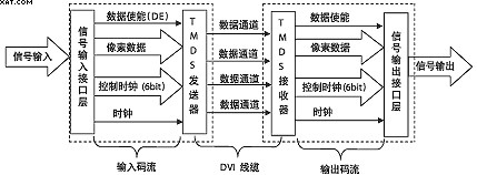DVI是基于TMDS(TransitionMinimizedDifferentialSignaling,轉(zhuǎn)換最小差分信號)技術(shù)來傳輸數(shù)字信號,TMDS運用先進的編碼算法把8bit數(shù)據(jù)(R、G、B中的每路基色信號)通過最小轉(zhuǎn)換編碼為10bit數(shù)據(jù)(包含行場同步信息、時鐘信息、數(shù)據(jù)DE、糾錯等),經(jīng)過DC平衡后,采用差分信號傳輸數(shù)據(jù),它和LVDS、TTL相比有較好的電磁兼容性能,可以用低成本的專用電纜實現(xiàn)長距離、高質(zhì)量的數(shù)字信號傳輸。TMDS技術(shù)的連接傳輸結(jié)構(gòu)如圖1所示。