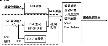 由原理圖看,數(shù)字電視增加DVI接口比較簡單,從硬件電路考慮,一是在接口處增加DVI解碼部分,二是在后端提供一個數(shù)據(jù)通道,如果電視原有方案中具有A/D轉(zhuǎn)換和相應的后級數(shù)據(jù)處理通道,那么DVI接口解碼輸出的數(shù)據(jù)可以與它共用,因為在數(shù)字信號格式一定的情況下,其碼率、行頻、場頻、時鐘是一致的。