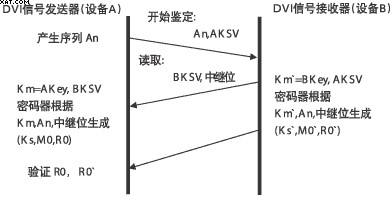 HDCP具體工作過程:首先由主機發(fā)送密鑰選擇導引序列(AKSV)和64bit偽隨機序列(An)到接收方,接收方回傳密鑰選擇導引序列(BKSV)和轉(zhuǎn)發(fā)器位(REPEAT-bit)(如是轉(zhuǎn)發(fā)器用以表示身份),發(fā)送方確認BKSV是否已被廢除和是否包含20個1和20個0;如果雙方的設備密鑰和KSV有效,則計算產(chǎn)生一個56bit的公共密鑰Km和Km`,然后可產(chǎn)生KS、KS`(傳輸密鑰)、M0、MO`(64bit后續(xù)驗證用追加初始序列)、RO、R0`(16bit指示驗證成功,它必須在AKSV發(fā)送后100ms內(nèi)傳回發(fā)送方;驗證成功后R01和R0相等;每128幀修正一次,每2s回傳一次)。因此當DVI接口中斷傳輸2s以上,或是非授權(quán)設備接收時,主機將停止傳輸內(nèi)容,以達到保護傳輸內(nèi)容的目的。HDCP鑒定處理過程如圖6所示。