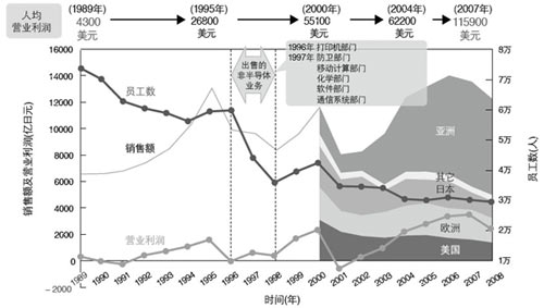 在這一巨大的轉變過程中,TI公司的營收也發(fā)生著變化。雖然1995年后營收出現縮減,但隨著DSP/模擬業(yè)務規(guī)模的不斷擴大,到2006~2007年,公司的營收便超過了變革以前的水平。尤其值得特別一提的是,公司員逐年減少,員工人均營業(yè)利潤的增長卻異常迅速,從1989年的人均4300美元、1995年的2。68萬美元,增長到了2007年的11。59萬美元,在l8年間增長了27倍,1995年~2007年的12年間也增長了4倍多。而且,公司在半導體業(yè)的排名也從1995年的第7位提升到了近年很穩(wěn)定的3~4位。