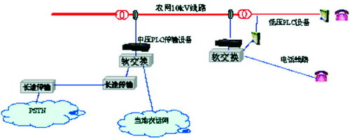 在發(fā)展中國家,這一矛盾尤其突出。就國內的情況而言,我國幅員遼闊,有相當數(shù)量的農(nóng)村地區(qū)處于偏遠、人煙稀少的地帶,這些區(qū)域的通信發(fā)展相對滯后。據(jù)統(tǒng)計,我國行政村固定電話覆蓋率為94%~97%,數(shù)據(jù)通信的覆蓋率則更低。由于自然和經(jīng)濟條件的制約,若采用現(xiàn)有的通信方式,改善這些地區(qū)的信息服務將面臨越來越多的困難。而行政村的通電率已接近100%,且電網(wǎng)覆蓋是區(qū)域發(fā)展的基本條件,因此,利用電力傳輸網(wǎng)絡實現(xiàn)寬帶網(wǎng)絡接入,是適合國情、可行并且經(jīng)濟的方案,圖1為農(nóng)村中壓PLC接入網(wǎng)系統(tǒng)的結構示意圖。