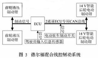 這種混合型制動系統(tǒng)能使車載的防抱制動系統(tǒng)、牽引力控制系統(tǒng)、車輛穩(wěn)定控制系統(tǒng)更好發(fā)揮功能,提供更好的制動操縱感覺和更好的響應(yīng)。而且該系統(tǒng)將為諸如電駐車制動、上坡行駛防滑、車輛起步助力、車輛下坡行駛提供新功能。這種新技術(shù)將簡化車輛的構(gòu)件組成,并提供更大的內(nèi)部空間布置的自由度。該系統(tǒng)的后輪電制動鉗與一臺直流電機(jī)和機(jī)械變速傳動裝置組成一體,外形尺寸只稍微大于傳統(tǒng)液壓制動鉗。用嵌入式微處理器控制“智能型”后輪電制動鉗,為后輪制動提供快速而平順的操作和“容錯控制”性能。
