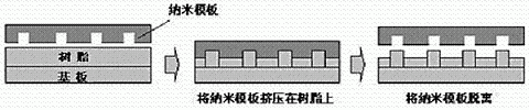 在納米印刷技術(shù)中,將金屬凸模擠壓樹脂薄膜上,便會形成凹部。但要形成平面比較大的細(xì)長結(jié)構(gòu),必須有深度雕刻的納米模板,因為模板從樹脂薄膜脫離時,必然會拉伸樹脂,所以能形成高出納米模板凹部的柱狀結(jié)構(gòu)體,這種方法就稱為高寬比納米印刷技術(shù)。
