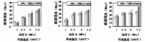 圖9顯示了焊接溫度、焊接時間、加壓等焊接參數(shù)對銀納米粒子銅觸點斷面強(qiáng)度的影響。從圖可得,焊接溫度和加壓是影響斷面強(qiáng)度的關(guān)鍵參數(shù)。在焊接溫度方面,強(qiáng)度隨著加壓增大而上升,但在焊接溫度高的情況下,加壓的影響會變小。另外就焊接溫度而言,加壓低的情況下,焊接溫度對強(qiáng)度影響大,而加壓增高時則焊接溫度的影響變小。所以,在260℃左右的溫度下加大壓力,而盡可能在低加壓場合提高連接溫度,這樣做才最有效。