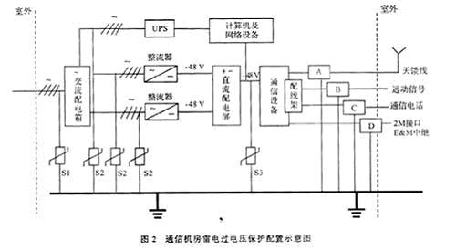 圖為我局通信機房雷電過電壓保護配置示意圖,其中S1為DEHNventil 280/4型電源1、2級復(fù)合防雷器,S2為DEHNguard T385型電源2級防雷器,S3為DEHNrail 48FML型電源3級防雷器(直流48 V),A為UGK/N(2.5 G)天饋線防雷器,B為YG20-A音頻隔離變壓器,C為ZH型中和變壓器,D為同軸防雷器。