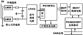 本節(jié)點的核心MCU是PIC16F87x,是Microchip公司推出的低功耗8位單片機。PIC16F87x擁有精簡指令集,執(zhí)行速度為200ns。CAN控制器采用Microchip公司的MCP2510,總線驅(qū)動器采用PCA82C250,總線隔離電路采用光耦6N317,信號調(diào)理電路采用LF412。溫度監(jiān)測模塊的硬件結(jié)構(gòu)如圖2所示。