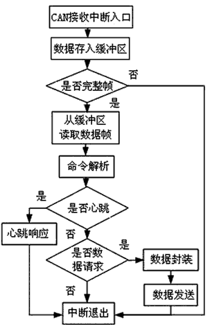 方法為連續(xù)采樣五次,通過比較判斷,去掉其中的最大值和最小值,其余三次的值求和后取平均值,把平均值作為CPU用來劃分溫度范圍的有效數(shù)據(jù)。數(shù)據(jù)包的解析和封裝都遵循CAN的應(yīng)用層協(xié)議,主程序流程如圖4所示。