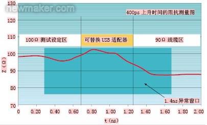 傳播通路中阻抗不連續(xù)性將會(huì)導(dǎo)致反射損失和信號(hào)失真。借助時(shí)域反射計(jì)(TDR),阻抗值可用時(shí)間函數(shù)直接顯示出來(lái)(見(jiàn)圖2),以便時(shí)刻監(jiān)測(cè)該數(shù)值是否符合USB系統(tǒng)的規(guī)定系統(tǒng)公差。