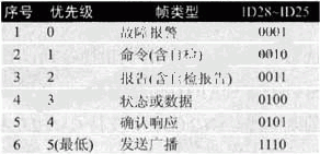 本協(xié)議采用幀優(yōu)先原則分配標(biāo)識(shí)符,每一幀標(biāo)識(shí)符中的高四位表示幀類型,不同幀類型有不同的優(yōu)先權(quán),優(yōu)先權(quán)決定了各種信息幀在同等情況下的發(fā)送順序,協(xié)議中的29位標(biāo)識(shí)符的分配如下: