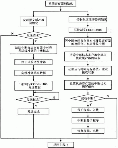 各控制器應(yīng)按規(guī)定格式和周期發(fā)送數(shù)據(jù)到總線上,同時(shí)也要接受其他控制器的信息。總線上的其他控制器則根據(jù)需要各取所需的報(bào)文。對(duì)于接收數(shù)據(jù),本系統(tǒng)采用中斷方式實(shí)現(xiàn)。一旦中斷發(fā)生,即將接收的數(shù)據(jù)自動(dòng)裝載到相應(yīng)的報(bào)文寄存器中,此時(shí)還可采用屏蔽濾波方式,利用屏蔽濾波寄存器對(duì)接收?qǐng)?bào)文的標(biāo)識(shí)符和預(yù)先在接收緩沖器初始化時(shí)設(shè)定的標(biāo)識(shí)符進(jìn)行有選擇地逐位比較,只有標(biāo)識(shí)符匹配的報(bào)文才能進(jìn)入接收緩沖器,那些不符合要求的報(bào)文則將被屏蔽于接收緩沖器之外,從而減輕CPU處理報(bào)文的負(fù)擔(dān)。此外,不同數(shù)據(jù)應(yīng)放入不同的報(bào)文寄存器中,因此在接收中斷服務(wù)程序中,就可以容易地判斷出中斷是由哪個(gè)接收?qǐng)?bào)文引起的,其程序流程圖如圖3所示。