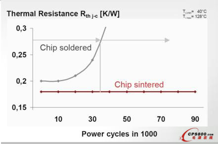 圖2.燒結(jié)芯片與焊接芯片的功率循環(huán)能力對(duì)比
