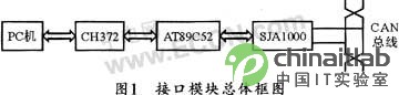 本文所介紹的USB-CAN轉(zhuǎn)接技術(shù)總體框圖如圖1所示,該設(shè)計(jì)分兩大部分:一是與主機(jī)USB接口相連的USB控制部分;二是與CAN總線相連的CAN控制器部分。兩者中間通過(guò)單片機(jī)聯(lián)系起來(lái)。USB控制部分用USB接口控制芯片CH372來(lái)實(shí)現(xiàn)數(shù)據(jù)的接收和發(fā)送;CAN控制器SJA1000用來(lái)實(shí)現(xiàn)CAN總線間的數(shù)據(jù)通信。單片機(jī)用來(lái)進(jìn)行相應(yīng)的控制、協(xié)調(diào)以及系統(tǒng)的通信。