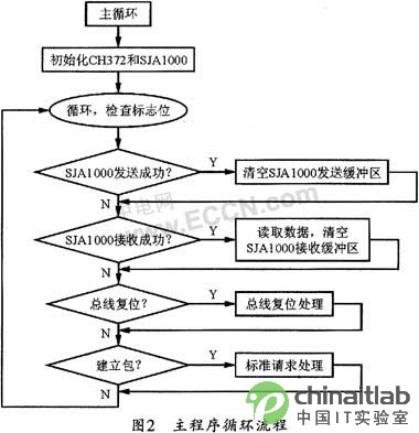單片機(jī)AT89C52在系統(tǒng)中主要起到一個(gè)橋梁和協(xié)調(diào)控制的作用。主機(jī)通過(guò)CH372把數(shù)據(jù)發(fā)送到單片機(jī),單片機(jī)再把數(shù)據(jù)通過(guò)SJA1000發(fā)送到CAN總線,從而實(shí)現(xiàn)整個(gè)系統(tǒng)的通信。此外,單片機(jī)還需要對(duì)CH372和SJA1000進(jìn)行初始化,并通過(guò)地址/數(shù)據(jù)以復(fù)用的方式訪問CH372和SJA1000。由于在訪問其中一個(gè)芯片時(shí),如果另一個(gè)芯片還保持有輸出,那么單片機(jī)就不能讀到正確的數(shù)據(jù),因此,單片機(jī)要通過(guò)片選控制信號(hào)分配有效地址。單片機(jī)主要通過(guò)主循環(huán)來(lái)監(jiān)控系統(tǒng)的通信,其主循環(huán)流程圖見圖2所示。[page]