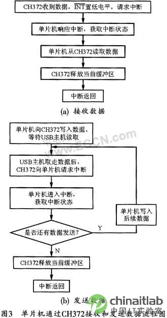 CH372芯片專門用于處理USB通訊。在接收到數(shù)據(jù)或發(fā)送完數(shù)據(jù)后,CH372將以中斷方式通知單片機(jī)進(jìn)行處理。單片機(jī)通過(guò)CH372接收和發(fā)送數(shù)據(jù)的流程圖如圖3所示。