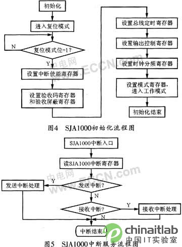 在CAN總線端,單片機(jī)控制著傳輸流程。SJA1000的初始化由單片機(jī)完成,其初始化流程圖見圖4所示,在正常工作模式下,單片機(jī)可控制SJA1000的收發(fā)等操作,以完成和CAN總線的通信。當(dāng)主機(jī)端傳來(lái)數(shù)據(jù)時(shí),單片機(jī)將數(shù)據(jù)轉(zhuǎn)發(fā)到SJA1000的發(fā)送緩沖區(qū),并由SJA1000根據(jù)CAN協(xié)議自動(dòng)封裝后發(fā)送到CAN總線上;當(dāng)SJA1000接收到來(lái)自CAN總線上的一個(gè)有效的報(bào)文后,系統(tǒng)將在INT引腳上產(chǎn)生一個(gè)硬件中斷信號(hào)(低有效),當(dāng)單片機(jī)收到中斷信號(hào)后,即進(jìn)人中斷服務(wù)程序,以完成數(shù)據(jù)的接收和處理,其中斷服務(wù)流程見圖5所示。
