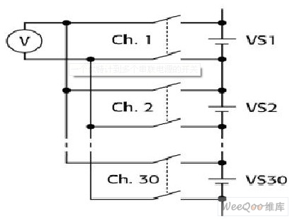 圖1給出了切換伏特計(jì)到多個(gè)串聯(lián)的30電壓源(VS)的情形。為了避免其中一個(gè)或多個(gè)發(fā)生短路,必須在關(guān)閉一個(gè)通道之前打開另一個(gè)通道(操作前斷開)。此外,要給每個(gè)電壓源串聯(lián)熔絲,避免超過(guò)卡的共模額定電壓。在這個(gè)例子中,每個(gè)電源都是12V,整個(gè)串聯(lián)電源的總電壓為360V。最好采用至少500V的通道-通道額定電壓和共模額定電壓。