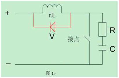 由于繼電器接點(diǎn)通斷的電流較小,接點(diǎn)間不會出現(xiàn)電弧,但會出現(xiàn)“火花放電”,這是由于接點(diǎn)電路中存在電感,則在斷開時(shí)電感上會出現(xiàn)過電壓,它與電源電壓一起加在接點(diǎn)間隙上,使剛分開一點(diǎn)距離的接點(diǎn)間隙擊穿而放電。由于能量所限,只會產(chǎn)生火花放電,接點(diǎn)間存在的電容與電感中能量的交替轉(zhuǎn)換,使火花放電時(shí)隱時(shí)現(xiàn),而成為一種高頻信號,再者火花放電對接點(diǎn)也會造成損傷,而會降低使用壽命,因此必須設(shè)法消除,實(shí)用的消火花電路有兩種,如圖1所示。一.其基本作用原理是,使電感中的能量不通過接點(diǎn)而通過rc;二.在斷開時(shí)經(jīng)過二極管v在負(fù)載r.l上消耗掉。在應(yīng)用中選擇一種就行了。但要注意的是,rc參數(shù)要選擇適當(dāng),參數(shù)主要靠實(shí)驗(yàn)來決定,通常電容c可按負(fù)載電流1a/1微法選擇。使用二極管時(shí)其正負(fù)極性應(yīng)連接正確。