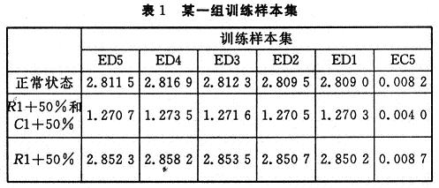 (1)構(gòu)造特征向量,提取能量特征信息:在pspice中對(duì)電路的每一種狀態(tài)進(jìn)行瞬時(shí)分析,取500個(gè)采樣點(diǎn),并對(duì)每一種故障模式進(jìn)行300次MonteCarlo分析,在Probe窗口中選擇菜單View\outputFile,或直接在Probe內(nèi)選擇菜單File\Export將波形采樣數(shù)據(jù)存盤,可得到out節(jié)點(diǎn)的具體信息,將數(shù)據(jù)轉(zhuǎn)化為MATLAB數(shù)據(jù)文件,然后進(jìn)行小波分析,在實(shí)驗(yàn)中,經(jīng)分析與比較,小波選擇db2小波,對(duì)每個(gè)故障信號(hào)進(jìn)行5尺度小波分解。得能量特征信息F=(ED5,ED4,…,ED1,EC5)。這里可利用MATLAB中的sumsqr函數(shù)。從而得到網(wǎng)絡(luò)的訓(xùn)練樣本集和測試樣本集。300次MonteCarlo分析,其中200次為訓(xùn)練樣本,100次為測試樣本。