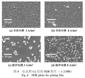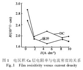 圖1是電沉積Cu層電阻率與電流密度之間的關(guān)系。可見(jiàn),脈沖電鍍得到的Cu鍍層電阻率小于相同電流密度下的直流鍍層。在小電流密度時(shí)(<2A/dm2),直流鍍層和脈沖鍍層的電阻率都較大。