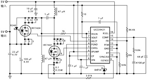 如果USB外設(shè)需要5V電源,事情就稍為有些棘手,因?yàn)閁SB口的外供電壓可能略高于也可能略低于這一數(shù)值。為此,以往常用先升壓再降壓或先降壓再升壓的辦法。這在需要多種輸出電壓的場(chǎng)合,倒也不失為一條可行途徑;但若僅需單一的5V輸出,此類(lèi)電路結(jié)構(gòu)便難免“疊床架屋”之嫌?;蛟S正是這一緣故,上述之SEPIC盡管電路復(fù)雜,成本也高,但因其能集升壓、降壓功能于一身,所以近來(lái)已呈應(yīng)用漸廣之勢(shì)。