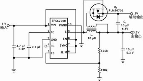 圖2是一種設(shè)計(jì)頗為緊湊的雙電壓輸出電路,工作頻率750kHz,變換效率可達(dá)95%。其中,3.3V主電源由降壓型單片同步開(kāi)關(guān)電源TPS62000構(gòu)成;該器件具有軟啟動(dòng)功能,能夠有效抑制輸入浪涌電流與輸出電壓過(guò)沖,最大輸出電流600mA。TPS62000的輸出端“L”為低電平時(shí),外接P溝道場(chǎng)效應(yīng)管Q1隨之導(dǎo)通而令儲(chǔ)能電感L1副繞組的感應(yīng)電壓向輸出電容C1充電,C1之端電壓同3.3V主輸出疊加即為輔助輸出電壓,其數(shù)值取決于L1主、副繞組的匝數(shù)比;輔助輸出若為5V,匝數(shù)比可取2:1。