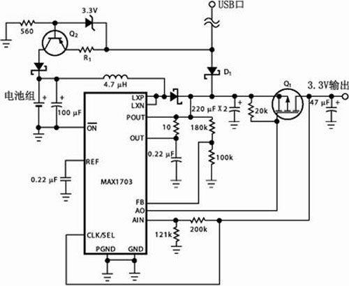 不少便攜式USB設(shè)備脫離主機(jī)后改由內(nèi)部電池組通過(guò)直流變換器繼續(xù)供電,故而需要配備一個(gè)小型UPS電源,圖3便是一種由單片開(kāi)關(guān)電源MAX1703構(gòu)成的實(shí)用電路。該集成器件采用同步整流PWM升壓型電路結(jié)構(gòu);可以單節(jié)鎳鎘/鎳氫電池供電,最低輸入電壓0.7V,輸出電壓可調(diào)范圍為2.5~5.5V,最大輸出電流1.5A,電源變換效率可達(dá)95%。圖3中,MAX1703開(kāi)關(guān)電源“POUT”端的輸出電壓設(shè)定為3.4V,而由P溝道場(chǎng)效應(yīng)管Q1與片內(nèi)備用放大器構(gòu)成的線(xiàn)性穩(wěn)壓器輸出電壓為3.3V,故而USB外設(shè)由電池組供電時(shí)Q1的功率損耗幾乎可以忽略。外部設(shè)備與USB口接通時(shí),二極管D1為正向偏置而使開(kāi)關(guān)電源處于“空閑”狀態(tài);也就是只要Q1的源極電壓高于3.4V,外部設(shè)備便始終由USB口供電。與此同時(shí),USB口還通過(guò)PNP晶體管Q2等組成的恒流源向電池組充電,調(diào)整電阻R1的阻值可以設(shè)定充電電流,使之符合十小時(shí)充電制的要求。一旦外部設(shè)備脫離USB口,開(kāi)關(guān)電源便會(huì)立即退出“空閑”狀態(tài)而由內(nèi)部電池組繼續(xù)供電。